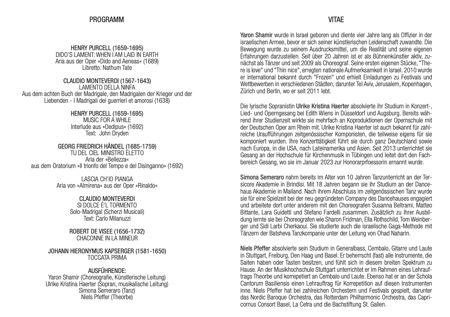 Unser performativer Konzertabend “LOVE – Entfaltungen der Liebe” wird von Yaron Shamir choreografiert und geleitet. Die musikalische Leitung liegt bei Ulrike Kristina Haerter, sie wird Arien von Henry Purcell und Georg Friedrich Händel singen. Simona Semeraro übernimmt den tänzerischen Part. Niels Pfeffer spielt die Theorbe.