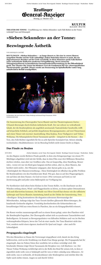Auf Grundlage des Gedankenstroms eines abgeschossenen Bomberpiloten kombiniert mit teilweise sarkastischen an amerikanische Soaps erinnernden Kommentaren von außen – werden unterschiedliche Mechanismen des Krieges analysiert und choreografisch-szenisch auf der Bühne umgesetzt.Indem der Pilot an heimatlich-idyllische Familienszenen denkt, hat er genügend Abstand, sich von den direkten Auswirkungen seines Tuns zu distanzieren: die Grenzen zwischen virtueller Realität, wie man sie aus zahlreichen Computerspielen kennt und den Formen der modernen Kriegsführung verschwimmen zusehends, somit sinkt auch – ganz anders als in Zeiten, in denen man dem Gegner Auge in Auge gegenüberstand –, die Hemmschwelle, Tod und Vernichtung zu bringen. Die subtilen Methoden moderner Kriegsführung haben bei ihm längst gefruchtet, denn sie arbeiten mit Feindbildern, Mechanismen des Wettrüstens, dem Implantieren eines diffusen Gefühls ständiger Bedrohung, einem Erziehungssystem, das auf Erschaffung von Superhelden und Einschüchterung basiert, das mit einer Art Gehirnwäsche Tötungsmaschinen im Namen des Glaubens oder sonst einer Ideologie kreiert.Doch auch in der noch so perfekten Kriegsmaschine bleibt als Störfaktor der Mensch, dessen Gehirn zwar gewaschen, nicht aber versiegelt ist, so dass Fragen aufkommen und Zweifel wach werden…Über Mittel des Tanztheaters kombiniert mit Schauspiel werden Mechanismen des Krieges, von Machtstrukturen und Manipulation aufgezeigt.Tickets und mehr unter: http://www.theater-reutlingen.de/index.php/stueck/index/313