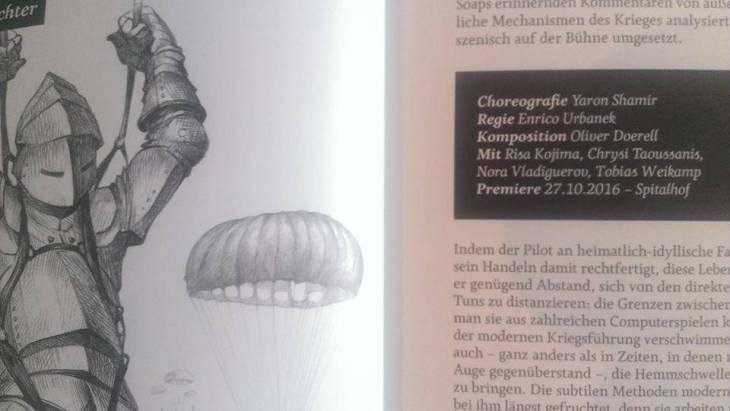 Based on the thoughts of a downed bomber pilot and combined with partially sarcastic reminiscents of American soap operas, different mechanisms of war are analyzed and implemented choreografically and scenically on stage.The pilot – by thinking of idyllic family scenes back home – distances himself from the direct effects of his actions: the boundaries between virtual reality become increasingly blurred, as we know from numerous computer games and the forms of modern warfare.Via dance theater combined with acting, mechanisms of war, of power structures and manipulation are shownin the piece.